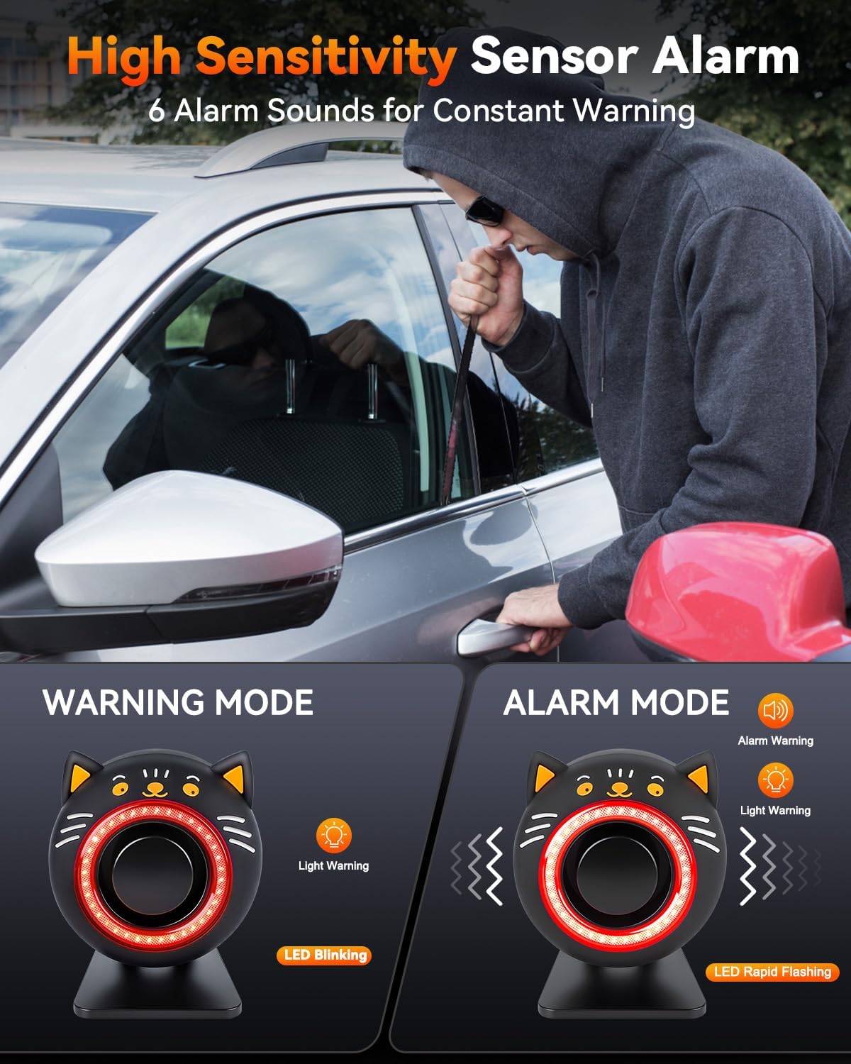 2 in 1 Cat-Shaped Car Vibration Sensor Alarm: This car alarm device is equipped with dual alarm modes of a max 120dB alarm sound and a red large aperture flashing light, which can effectively scare off potential thieves and protect your car when arming it with the analog false alarm light warning function