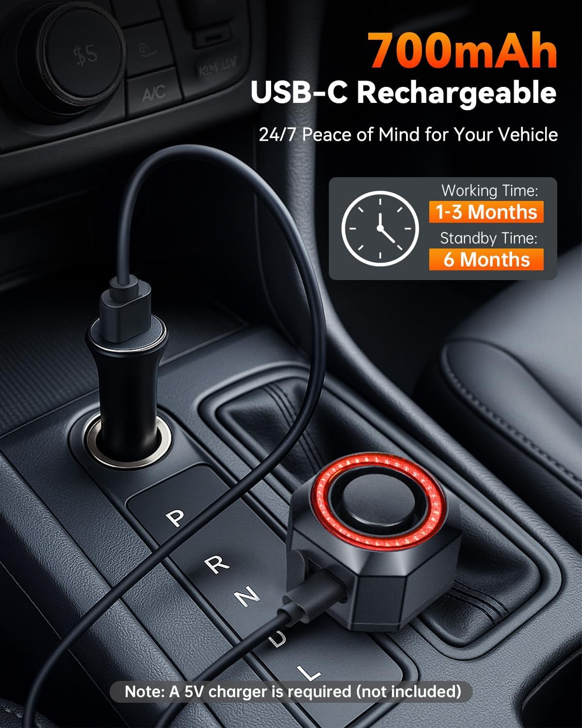 Long Life Charging Design: Car theft prevention device host has a built-in 700mAh battery, the Type-C interface supports 5V/0.3A charging. It can be fully charged in 3 hours, and the battery life is up to 3 months (1-3 months of continuous use). It is visualized by a red light circle while charging, and red light will automatically go out when fully charged. The device can be quickly disassembled and charging maintenance can be completed without complicated operation