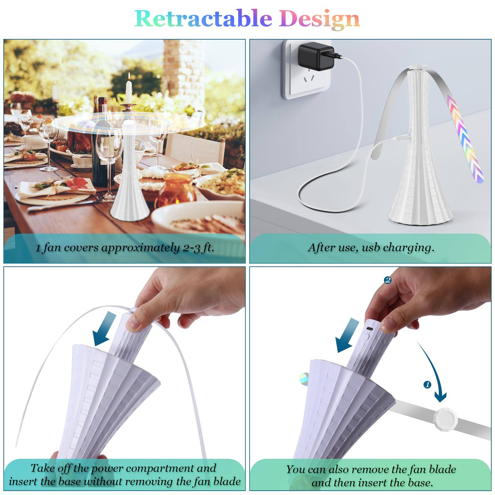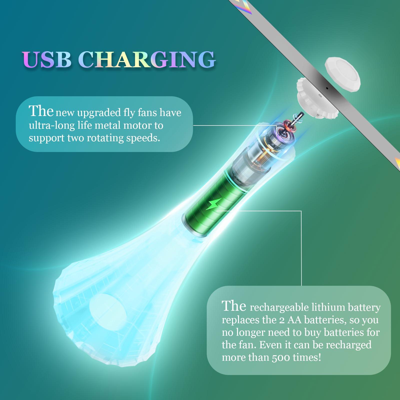 Space-Saving & Portable: The USB fly fans have an updated storage design, splitting into a power compartment and a base. When not in use, the power compartment can be detached and stored in the base, reducing the overall height from 9.45 inches to 5.12 inches. This compact design makes it easy to carry the fly fans in a backpack.