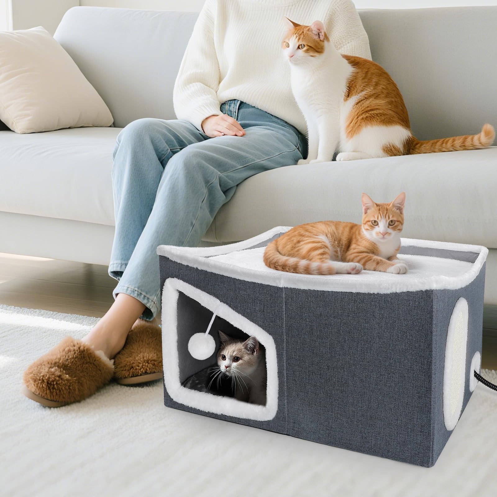 Heated Cat House for Indoor, Large Cat Bed with Heating Pad, Adjustable Temperature & Timing, with Fluffy Ball Hanging and Scratch Pad, Foldable Pet Hideaway for Small Medium and Large Cats(XL)