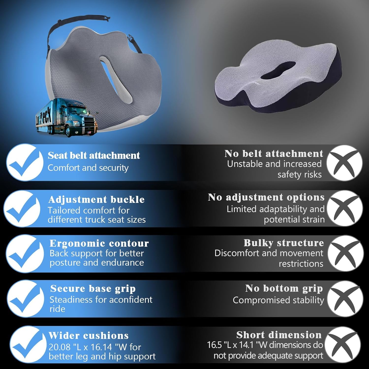 We listened to truckers and refined our design. The new dimensions (20.08"L x 16.14"W x 2.76/4.33"H) deliver enhanced hip and leg support, ensuring all-day comfort on even the longest routes.