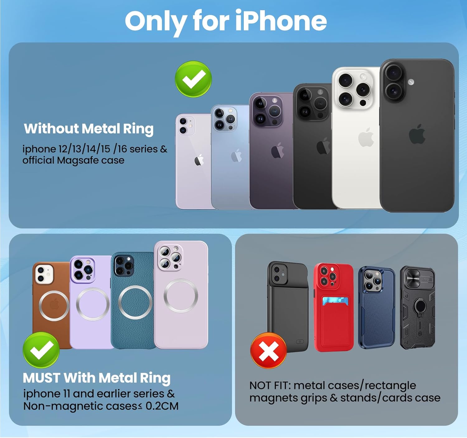 Designed for iPhone 16/15/14/13/12 series (direct magnetic attachment) and iPhone 11/XS/XR & earlier (with included metal ring). 20 N52 super magnets provide a 3.97 lbs hold—stays secure even on sharp turns or bumpy roads.