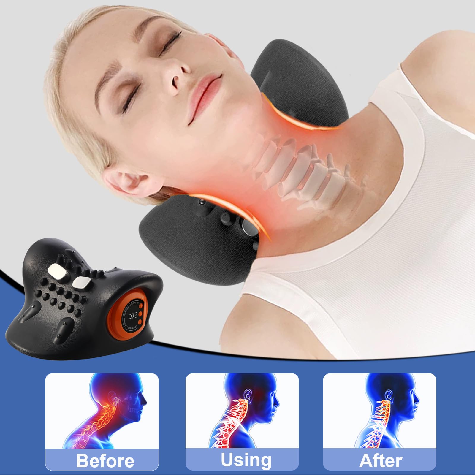 【 Just 15 minutes a day】Just 15 minutes a day with this neck stretcher can help relieve neck pain. This neck massager is perfect for people who often look down, sit still for along time, improper sitting posture. The neck traction device reduces neck pressure and discomfort, helping to restore the natural curve of your neck