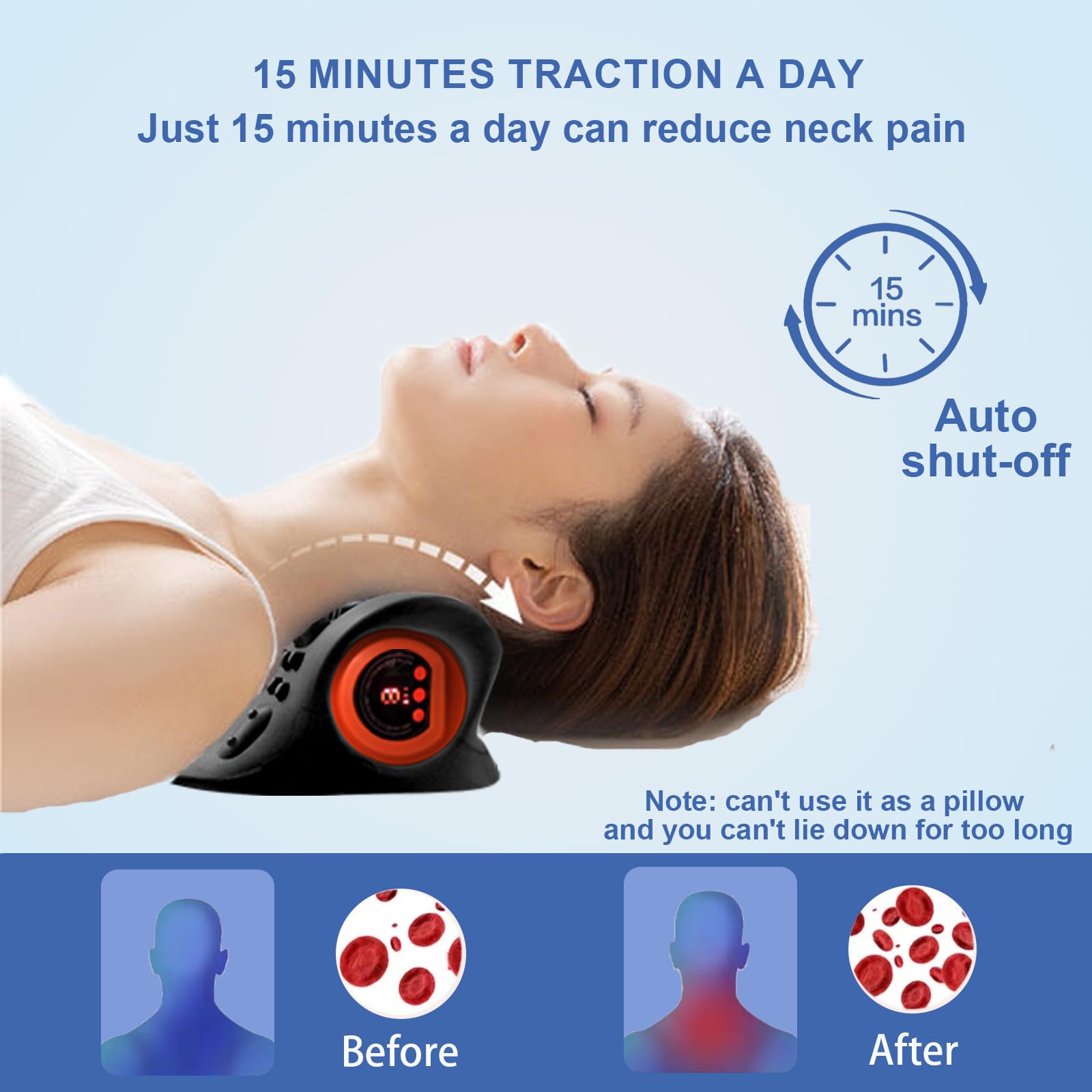 【Lightweight & Portable】 Built-in 1200mAh battery, Designed with a 15-minute auto shut-off feature to ensure safe use and prevent overuse. It can be used for 1.5-2 hours once fully charged. Compact and lightweight, allows you to address neck problems anytime and anywhere