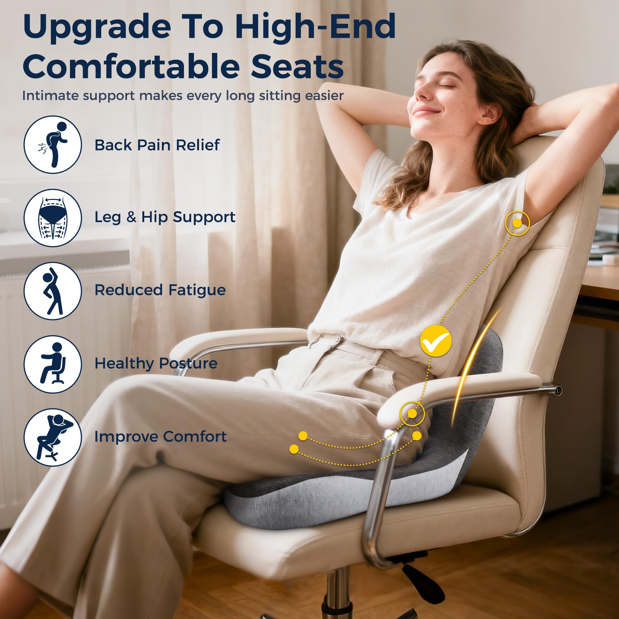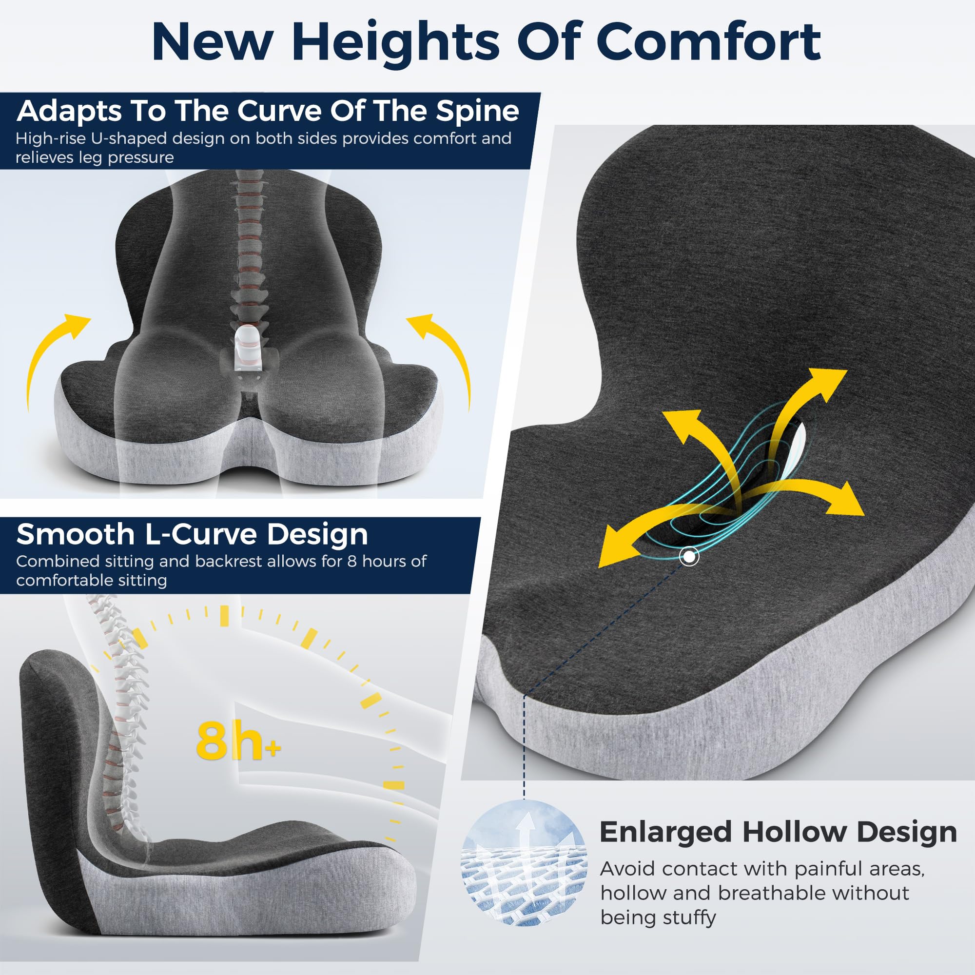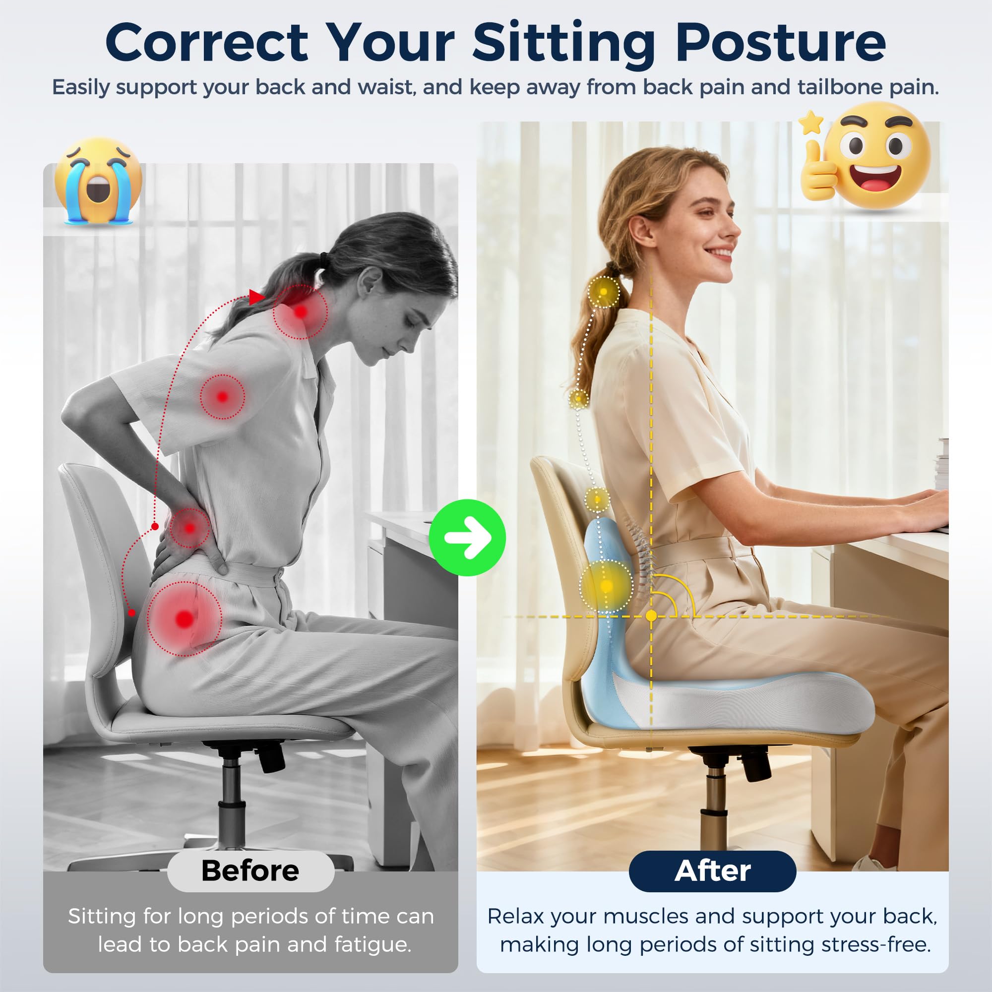 【Ergonomic One-Piece Design】:This L-shaped seat cushion is an integrated chair cushion that perfectly fits the natural curve of your spine, providing firm lumbar and hip support. Our office chair cushion encourages a healthy S-shaped posture, and reduces discomfort from long sitting sessions.