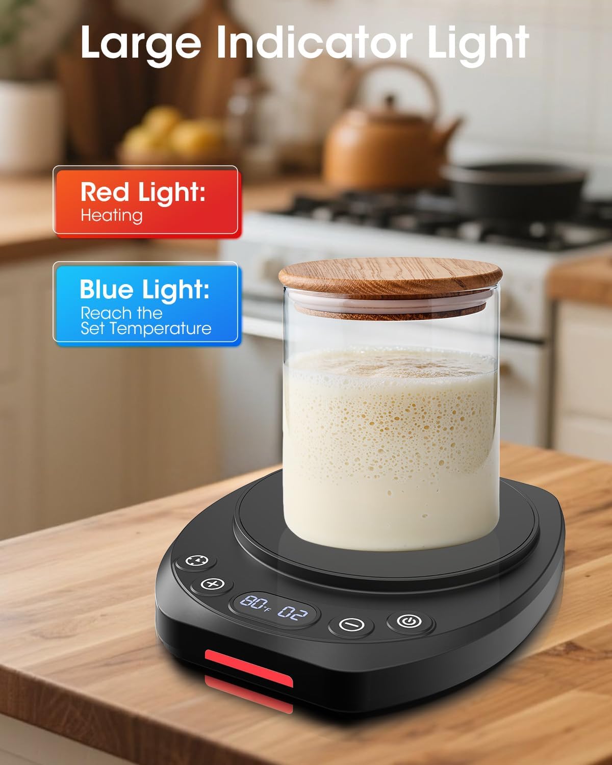 • 【Smart Thermostat Memory for Faster, Easier Fermentation】Supports precise 1°F temperature control (70-120°F / 21-49°C).Just place your jar on the warmer—it maintains the setting temperature to accelerate fermentation, effectively reducing wait time—especially on cold days.Memory function retains your last temperature setting for convenience.