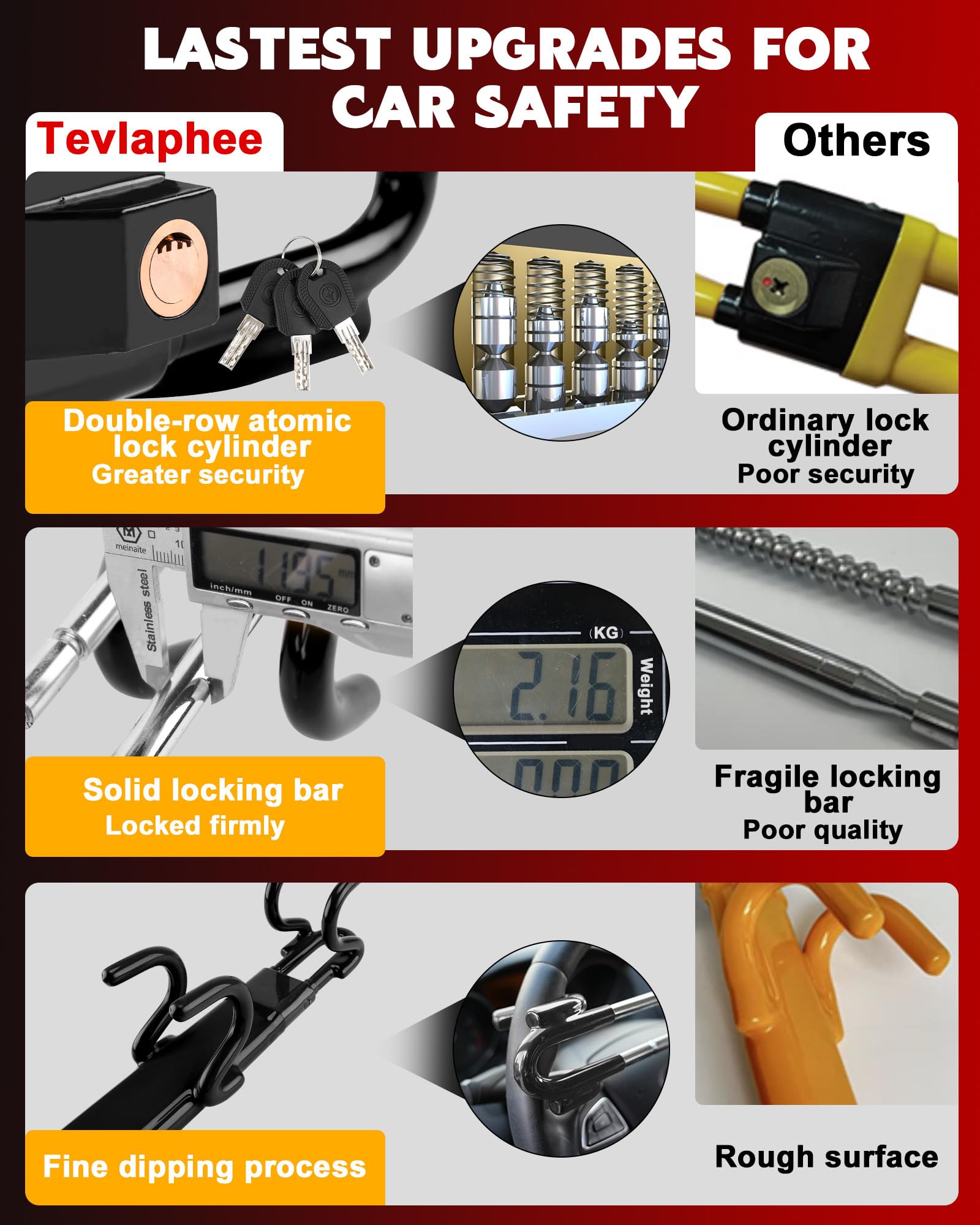 Crafted from top-tier hardened steel, the lock boasts a high-strength solid bar that resists break-ins. The durable pure copper lock core and precision-engineered double-spring crescent key prevent tampering, even by professional thieves. Plus, the plastic-dipped coating safeguards your steering wheel from scratches.