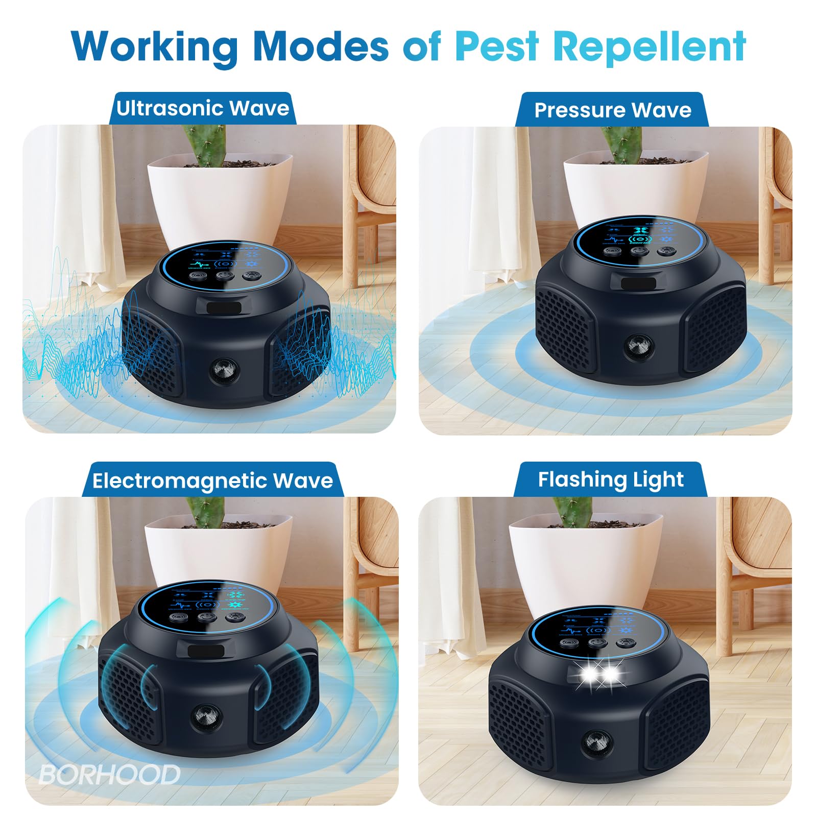 Three Smart Modes for Targeted Control: Tackle any infestation level with three specialized modes. Choose from Small (standard ultrasonic) for general maintenance, Medium (pressure wave) for moderate issues, or Large (electromagnetic) to penetrate walls and furniture for pests hidden deep within your home's structure.