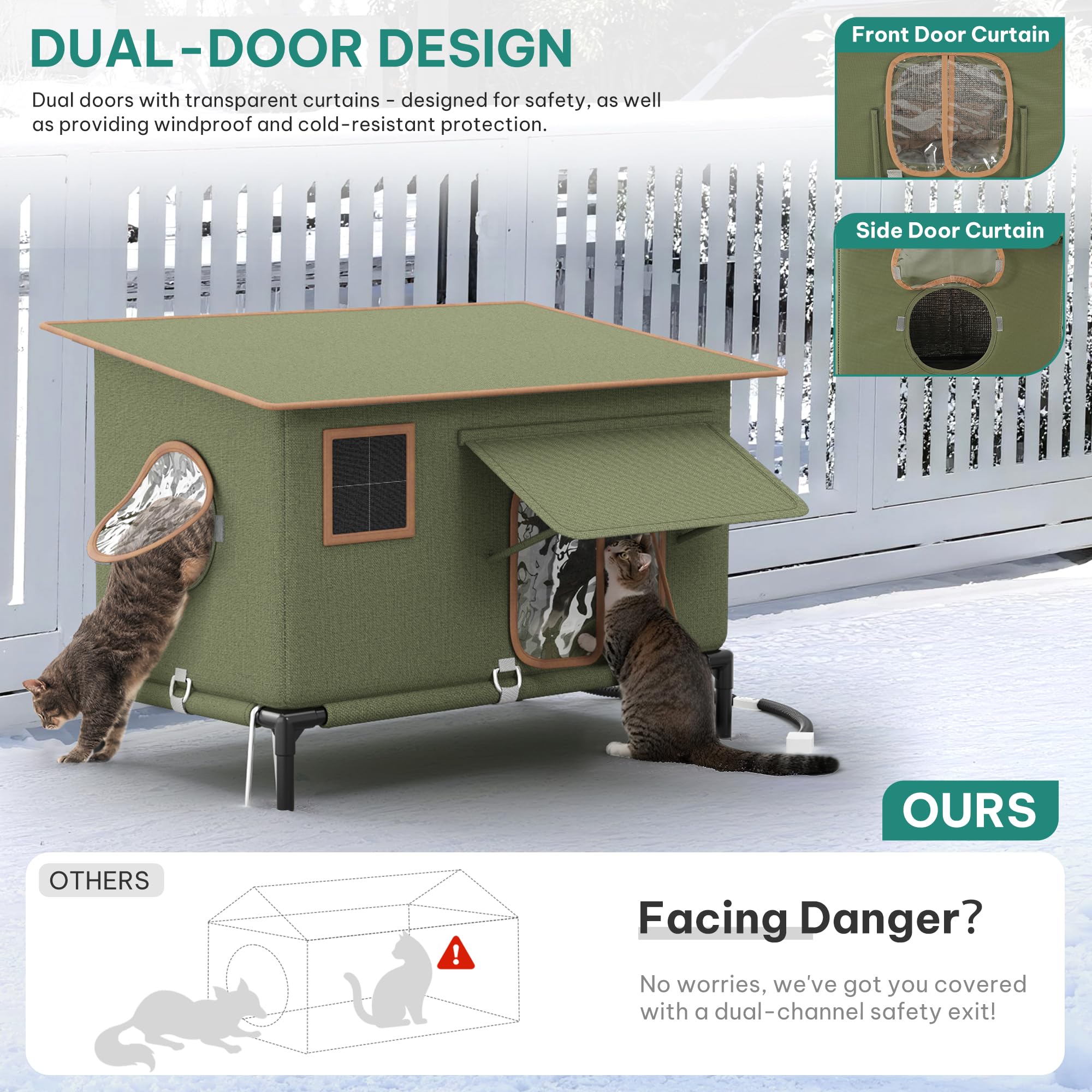 Dual-Door Safety for Peace of Mind: Featuring a smart dual-door design, this shelter ensures your furry visitor always has a safe escape route from potential predators. Both entrances are equipped with clear, heavy-duty weather flaps that effectively block wind and rain while allowing cats to see outside, reducing anxiety.